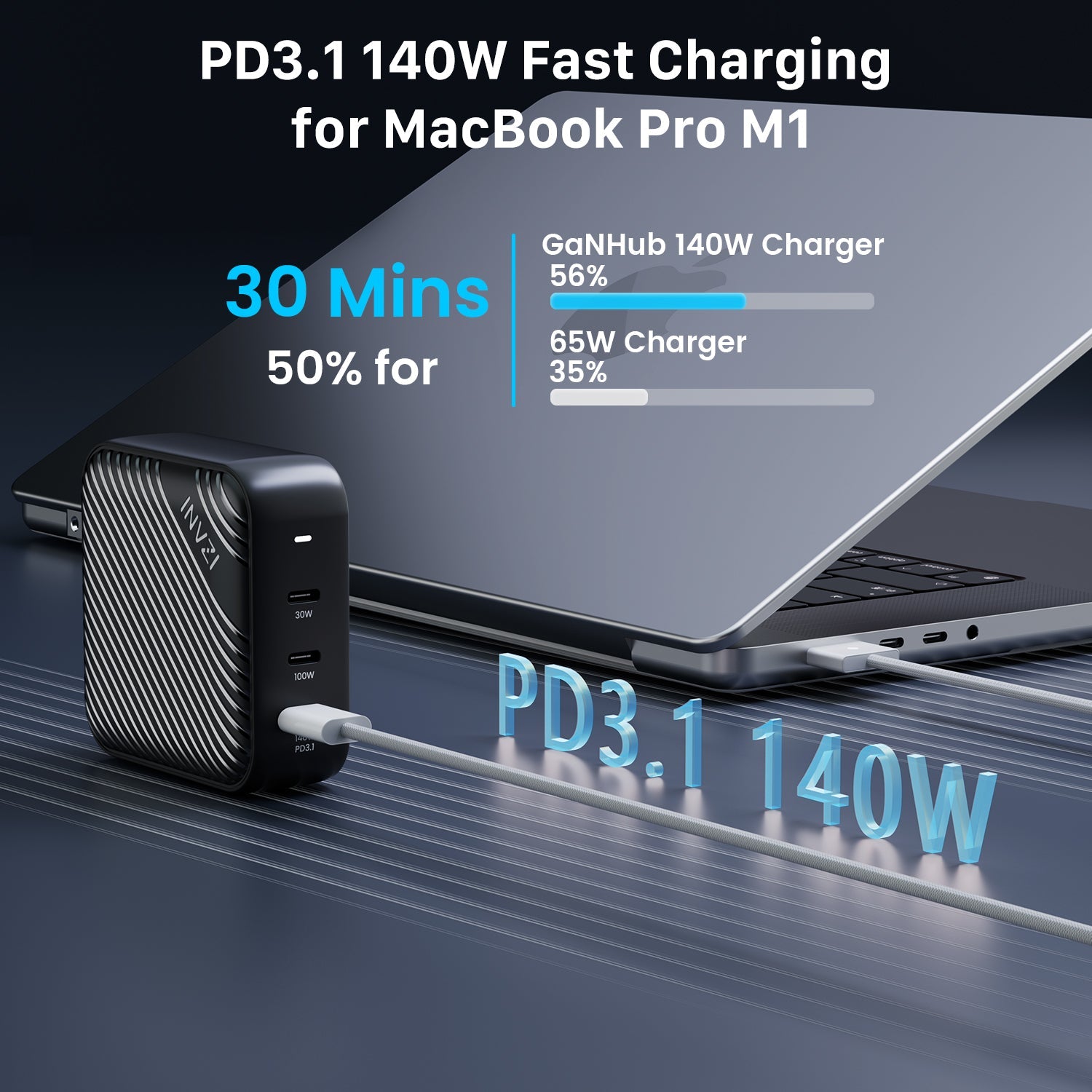 Experience the future of charging with the GaNHub 140W supporting the new PD3.1 charging protocol. This charger delivers a maximum of 140W fast charging, specifically designed for the MacBook Pro M1/M2/M3 16-inch. Charge your device to 50% in just 30 minutes, ensuring you stay productive without long waits.